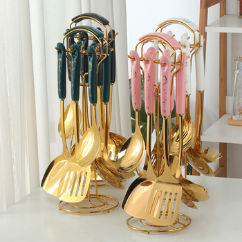 Venta al por mayor Chinaware Cooking Gift Set Acero inoxidable 6 piezas Juego de utensilios de cocina y soporte con mango de porcelana